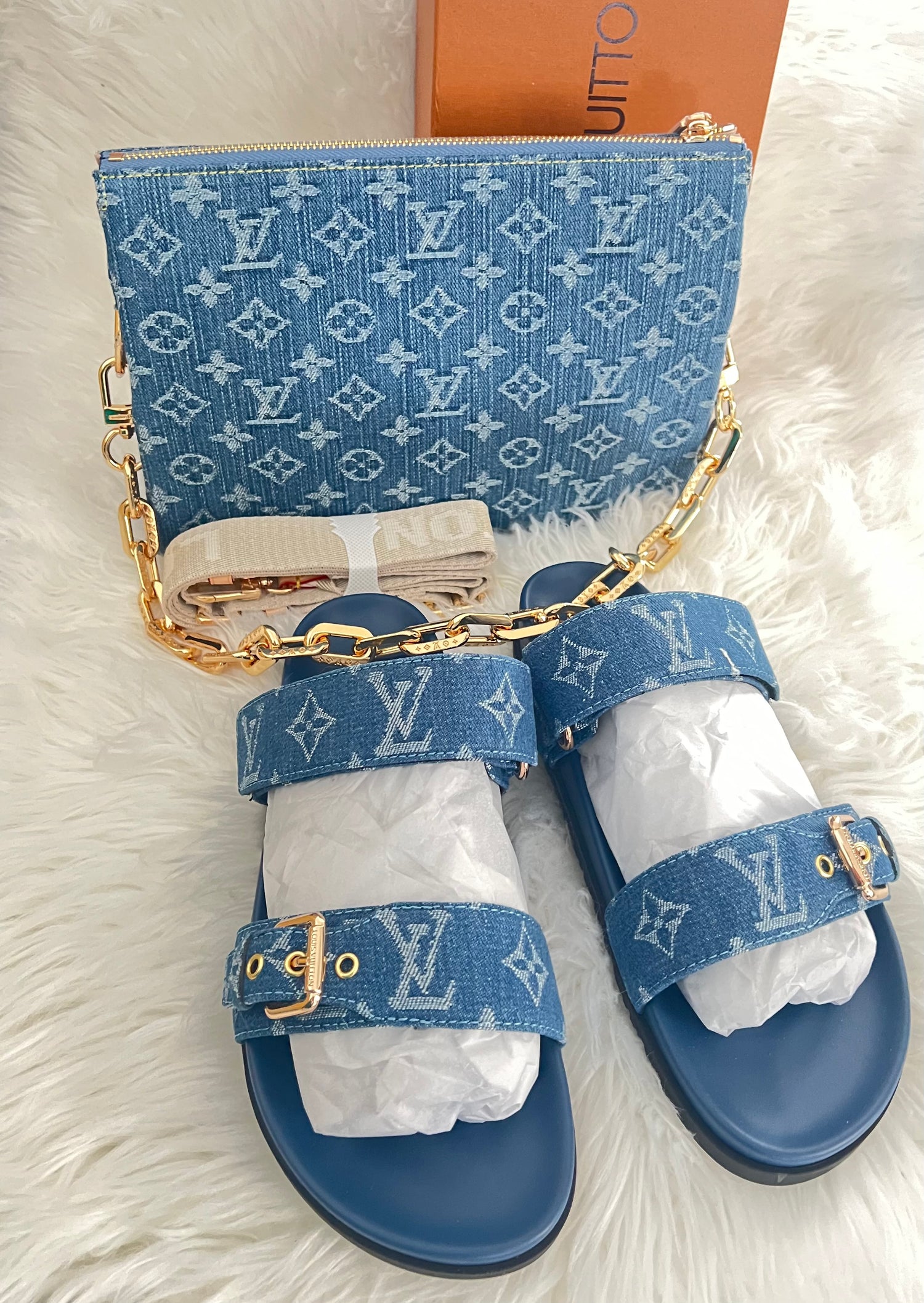 This new and refreshed denim sandals and matching clutch is a must have in your summer wardrobe. Our customers are loving its high quality and chic look.